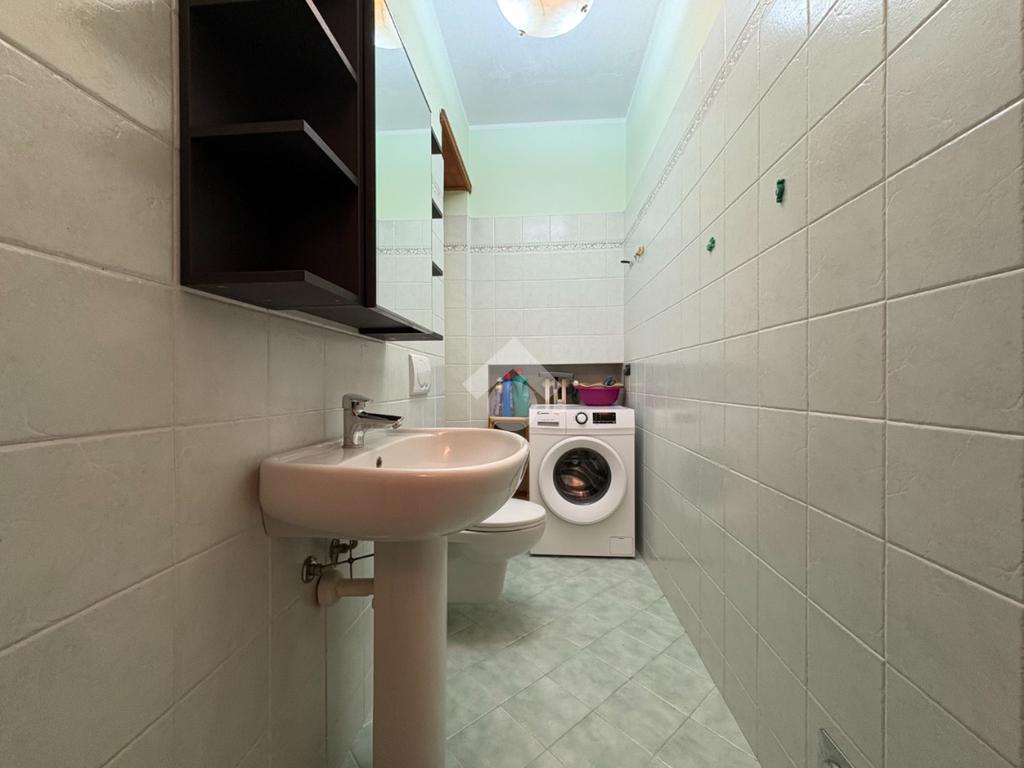 La soluzione è completata da doppi servizi: un bagno principale e un secondo ambiente più piccolo, ideale come lavanderia o ripostiglio.